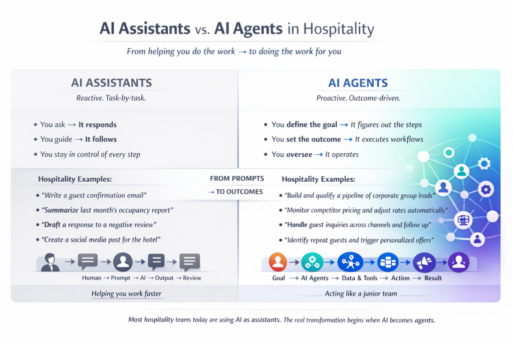 There’s a lot of noise right now around “AI agents.” And if you’ve been nodding along in meetings pretending you fully get the difference between an assistant and an agent… you’re not alone. So let’s simplify this in plain hospitality terms. Because this isn’t just semantics — it’s a fundamental shift in how work gets done in our industry.
