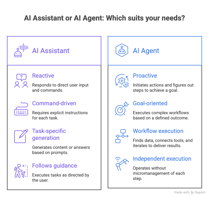 Think of tools like ChatGPT, Claude browser version, or Gemini as your very fast, very capable intern who writes emails, summarizes reports, drafts marketing copy, and helps you think — but still needs you to tell it what to do, guide each step, and review everything.